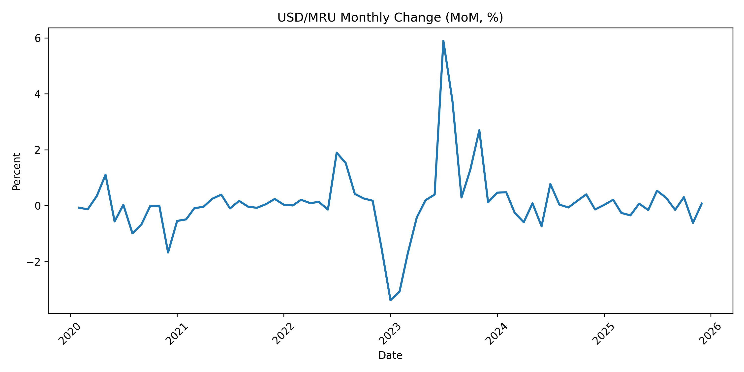 - Does USD/MRU exchange rate movement transmit into inflation?