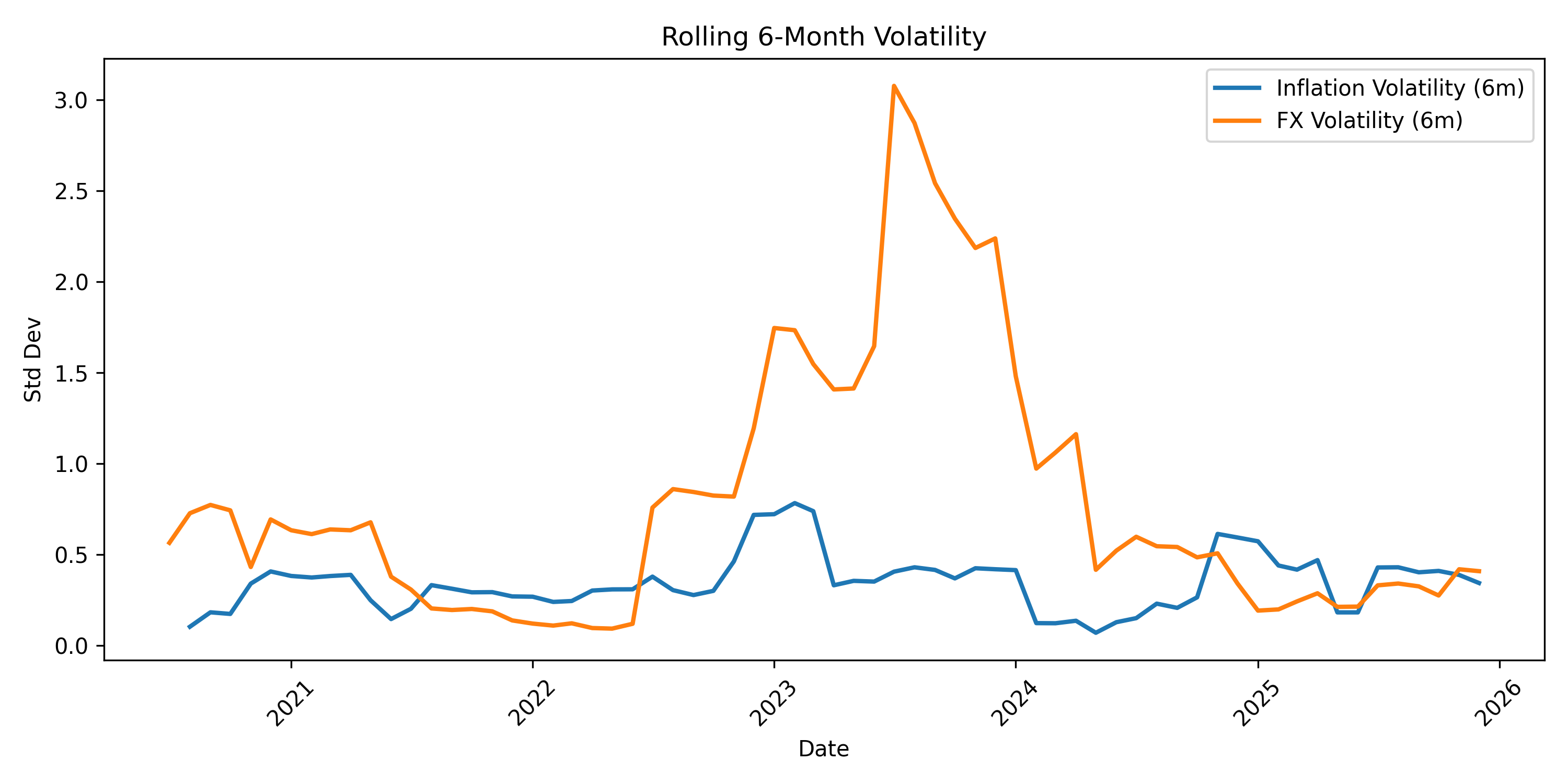 \[ Inflation_t = \alpha + \beta \cdot FX_{t-k} + \varepsilon_t \]