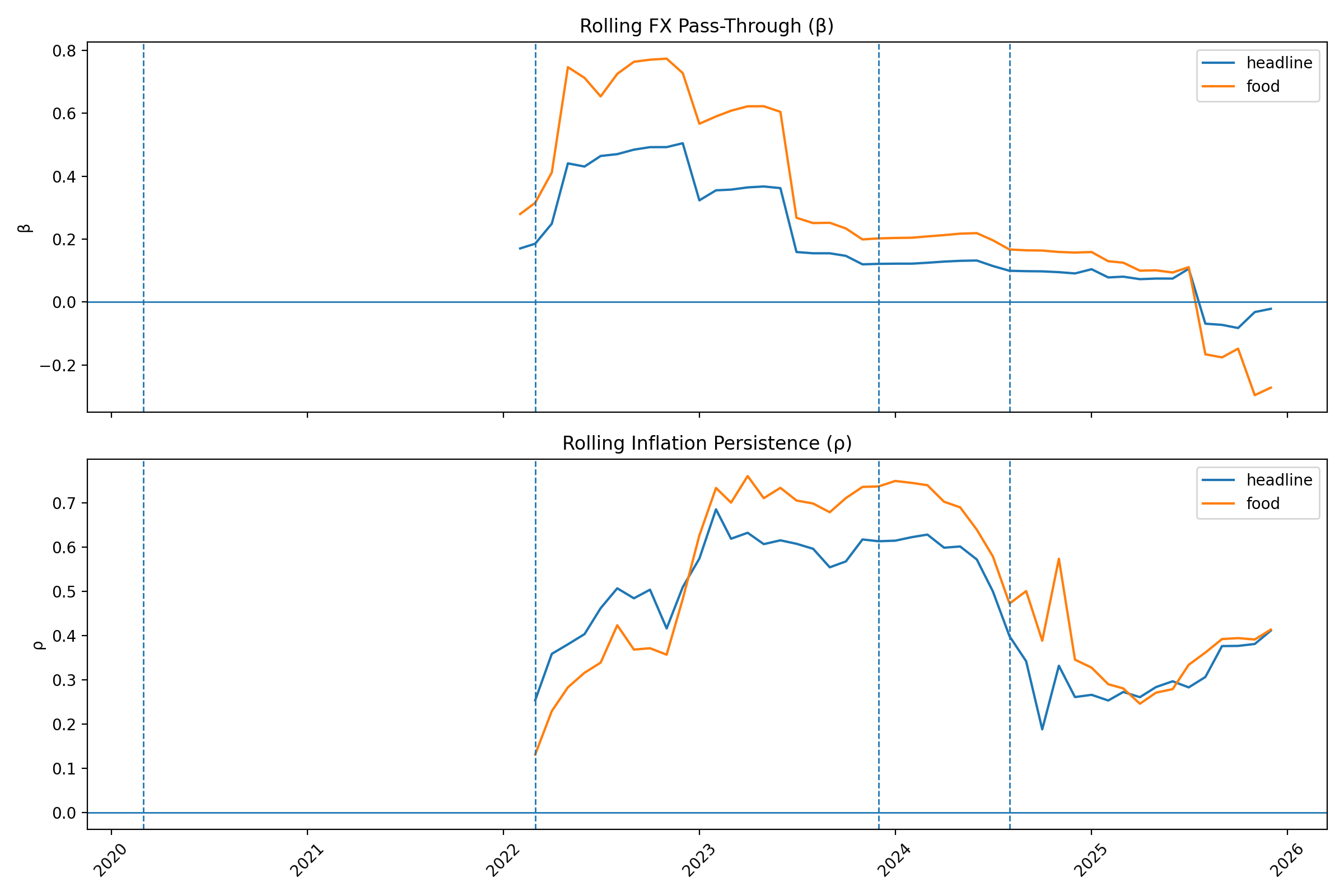 - In 2024-2025, the FX-to-inflation relationship collapses (β ~ 0 or negative).
